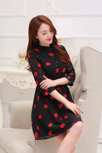 2015夏裝新款紅唇連衣裙 中長款七分袖修身雪紡衫顯瘦打底裙女裝 /
