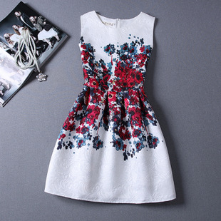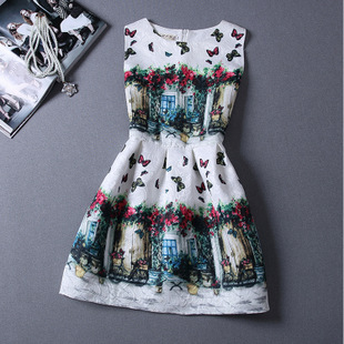 Y94082015夏季復(fù)古風(fēng)大牌水墨畫印花顯瘦無(wú)袖背心連衣裙打底裙子 /