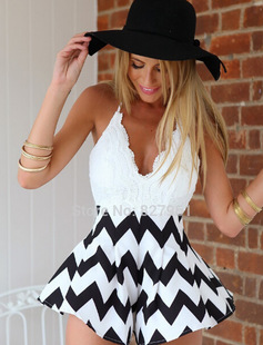 2015夏裝ebay速賣通爆款歐美性感露背綁帶幾何圖案蕾絲拼接連體褲 /