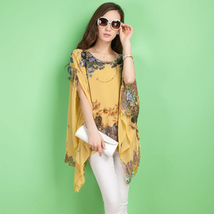 胖MM大碼套頭印花不規(guī)則寬松蝙蝠袖雪紡衫短袖T恤女 /