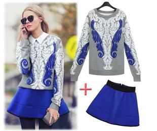 歐洲站2014時尚特色圖騰前后提花套頭毛衣+高腰短裙套裝 /