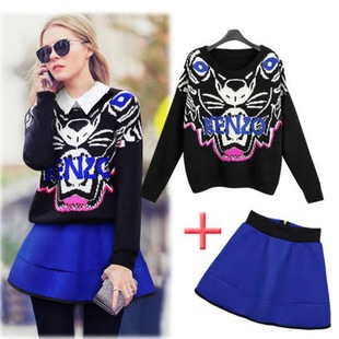 歐洲站2014秋冬新款上鏡老虎頭寬松毛衣高腰蓬短裙兩件套套裝女 /