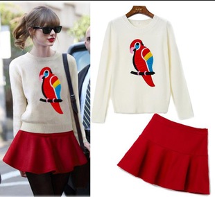2014秋冬新款歐美女裝連衣裙修身顯瘦長袖鸚鵡毛衣短裙兩件套裝 /
