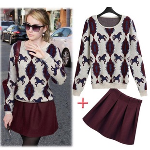 2014春裝新款女裝 針織小馬提花長袖毛衣+半裙兩件套裝 /