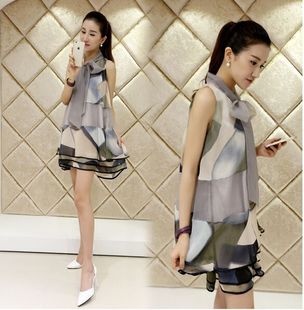 2015夏季新款歐根花無(wú)袖連衣裙韓版寬松A字娃娃紗時(shí)尚印 /