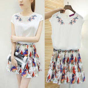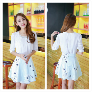 2015夏季新款刺繡兩件套裝夏季女裝新款短袖印花顯瘦蓬蓬裙連衣裙 /