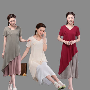 • 實拍  日系森女文藝范 假兩件寬松大擺長款棉麻連衣裙 /