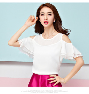 • 2015韓版休閑露肩寬松顯瘦荷葉袖雪紡衫女修身雪紡上衣 /