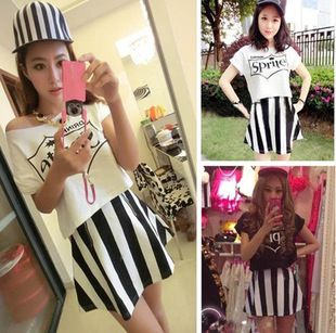 韓范小清新套裝 鉚釘字母寬松T恤+黑白條紋高腰短裙 /