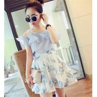 夏季新款女裝韓版復(fù)古清新荷葉邊露肩上衣+高腰半身裙套裝 /