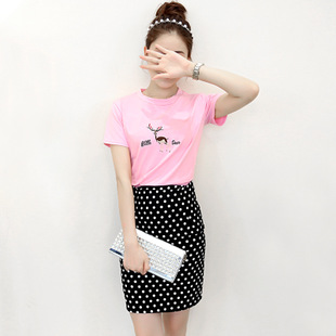 實拍2015新款繡花T恤小鹿T恤+波點短裙套裝 /