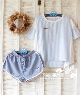 日系女 韓國(guó)原宿塔卡風(fēng)軟妹條紋貓咪刺繡棉麻短褲配短袖寬松T恤 /