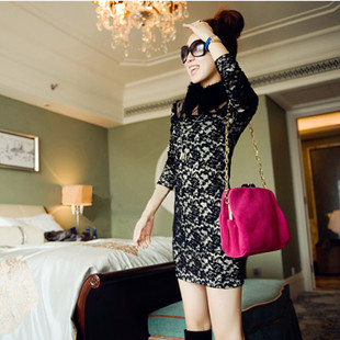 2015韓版女裝修身緊身包臀打底蕾絲加絨加厚連衣裙 /