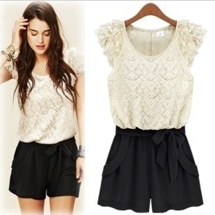2014新款蕾絲連體褲短褲韓版連體褲 女夏系腰帶連衣褲 /