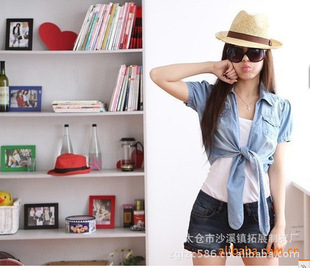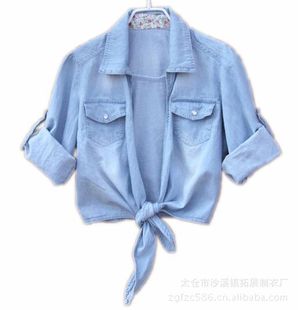 廠家直銷 日式外貿(mào)女裝短袖牛仔前打結(jié)外套/打結(jié)牛仔襯衫/外套 /