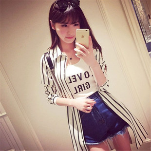 2015春夏新款韓版大牌百搭豎條紋休閑中長款襯衫防曬衣開衫女 /