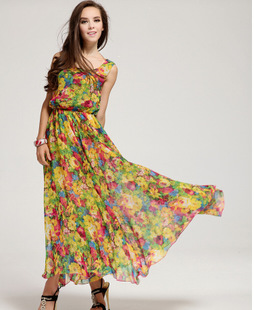 2015春夏新品沙灘裙 韓版修身印花雪紡連衣裙 波西米亞長裙 /