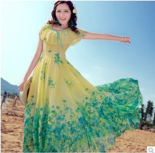 韓版女裝雪紡連衣裙夏季大擺連衣長裙波西米亞沙灘拖地裙 /