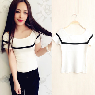 夏季韓版修身?xiàng)l紋針織女短袖露肩一字領(lǐng)針織T恤女薄上衣廠家直銷 /