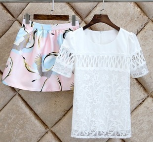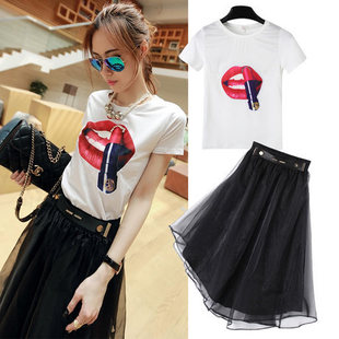 歐洲站夏裝誘惑紅唇T恤 不規(guī)則歐根紗連衣裙半身裙套裝 /