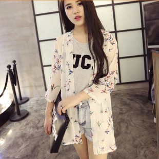 2015夏女防紫外線防曬衣衫中長款印花小鳥大碼開衫薄雪紡衫五分袖 /