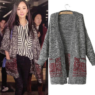 楊冪同款 2014秋裝新款女裝毛衣外套女 寬松撞色歐美針織衫開衫 /