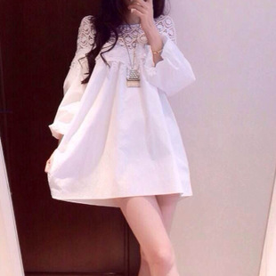 2015春夏新款胖mm加大碼女裝 韓版優(yōu)雅鏤空紗網(wǎng)顯瘦長袖連衣裙子 /