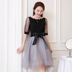 夏季連衣裙2015新款韓版時(shí)尚套裝裙女裝兩件套歐根紗復(fù)古短袖 /