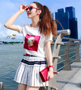 2015菁菁同款夏季新款仿真絲緞印夢露短袖T恤+條紋短褲套裝 /