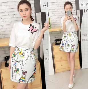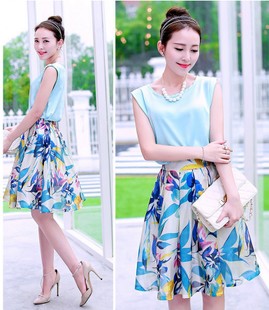 2015新款女裝韓版兩件套印花半裙加彩色上衣套裝女 送項鏈 /