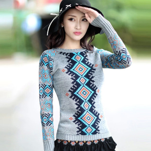 2015秋冬新款女裝復(fù)古幾何提花長袖套頭毛衣女打底針織衫批發(fā) /