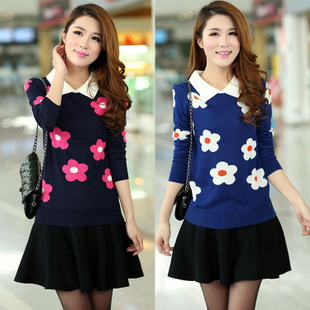 韓國毛衣秋冬新款女士針織衫 印花長袖套頭娃娃領毛衣打底 廠家批 /