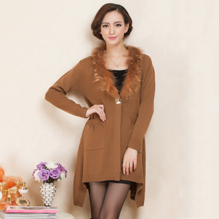 2014秋季新款女裝 韓版修身大碼針織衫 女式開衫中長款帶毛領外套 /