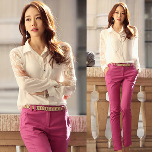 2015春季新款女裝修身雪紡衫氣質OL蕾絲長袖女式襯衫招網(wǎng)絡代理 /