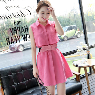 新款夏裝淑女韓版假兩件連衣裙收腰無(wú)袖棉麻裙子透氣亞麻短 /
