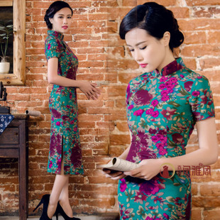 復古優(yōu)雅經(jīng)典款改良旗袍 百搭收腰盤扣亞麻印花包臀連衣裙708 /