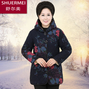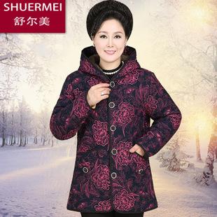 2014中老年女裝棉衣大碼媽媽裝連帽加絨加厚大花婆婆棉服外套批發(fā) /