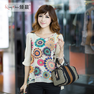 【伙拼】?jī)A晨2014韓版春夏加大碼女裝胖mm大碼服裝寬松印花雪紡衫 /