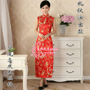 滴水領(lǐng)鳳尾花長款旗袍 大紅迎賓剪彩禮儀表演唐裝旗袍 拍照長旗袍 /