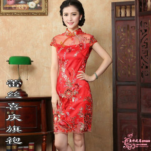 新款刺繡蕾絲喜慶旗袍 改良復(fù)古修身性感短旗袍 結(jié)婚旗袍敬酒禮服 /