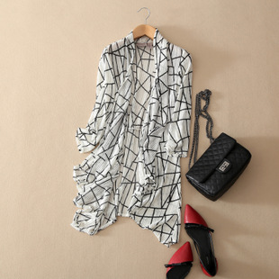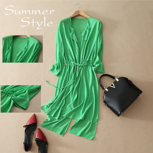 夏季新品原單歐美風(fēng)長款針織衫 外貿(mào)寬松七分袖挽袖系繩開衫上衣 /