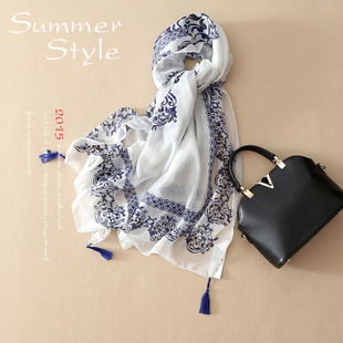 2015歐美原單新款夏季防曬遮陽披肩 外貿(mào)名族復(fù)古青花瓷純棉圍巾 /