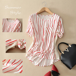 2015夏季日本原單舒適純棉條紋T恤女 外貿(mào)花邊拼接田園風(fēng)短袖上衣 /