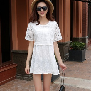 品牌女裝新款2015純棉白色鏤空拼接刺繡假兩件連衣裙高腰短袖夏季 /