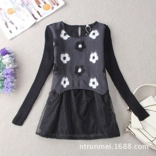 2015秋季新款 韓版歐根紗拼接毛昵針織打底衫 女式假兩件針織衫 /