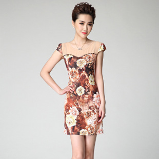 2015 夏裝新款時(shí)尚牡丹女裝數(shù)碼印花網(wǎng)紗修身短袖連衣裙 /
