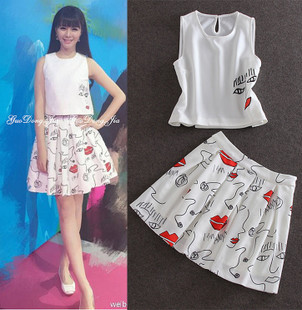 2015歐美大牌女裝五官印花短款無袖上衣+紅唇百褶短裙半身裙套裝 /