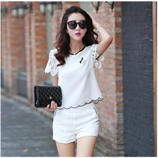 • 夏裝新款蕾絲上衣短褲修身兩件套裝夏季時(shí)尚休閑套裝女 /