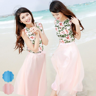 2015夏裝新品兩件套度假歐根紗裙套裝 印花無(wú)袖上衣+裙子女潮 /