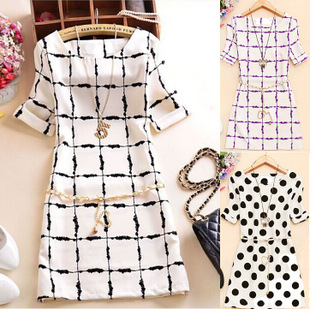 • 2014夏裝速賣通新款韓版修身顯瘦A字黑白格子短袖連衣裙女裙 /